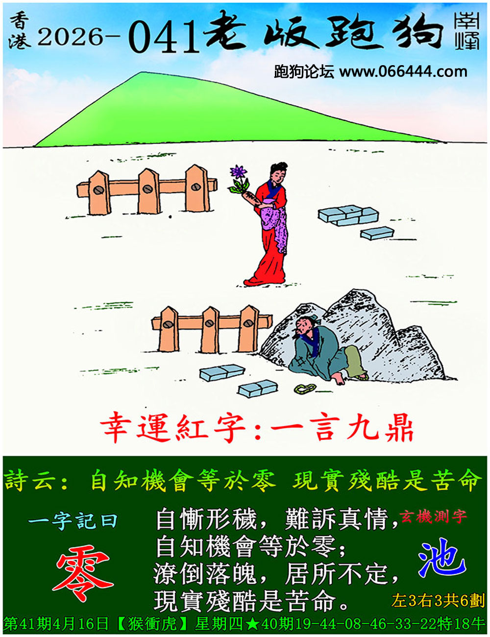 041期老版跑狗一字記之曰:【零】 詩雲:自知機會等於零,現實殘酷是苦命。 自慚形穢,難訴真情,自知機會等於零; 潦倒落魄,居所不定,現實殘酷是苦命。 玄機測字:《池》
