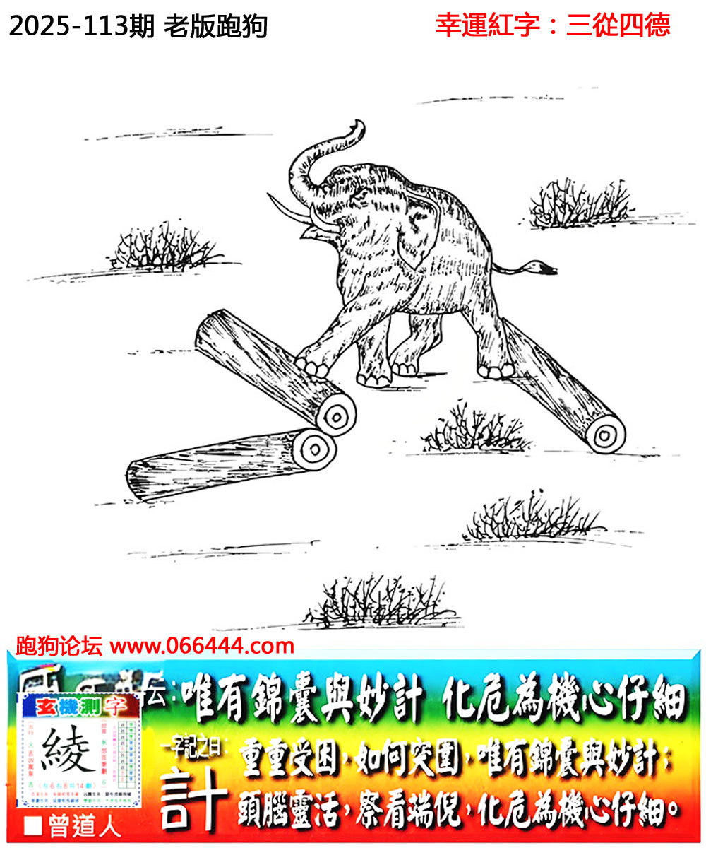 113期老版跑狗一字記之曰:【計】 詩雲:唯有錦囊與妙計,化危為機心仔細。 重重受困,如何突圍,唯有錦囊與妙計; 頭腦靈活,察看端倪,化危為機心仔細。 玄機測字:《綾》